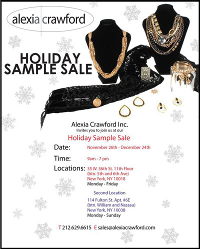 WHY: Save up to 80% off retail prices at the Alexia Crawford Holiday Sample Sale. Trendy jewelry must-haves from the 2010 Spring and Summer Collection. New items are delivered everyday, and there is always something stylish to choose from. Prices range from $5-$20 on jewelry, handbags, scarves, and hair accessories. All one-of-a-kind pieces are all specially priced.