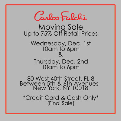 WHY: Up to 75% off retail prices at the Carlos Falchi Sample/Moving Sale. Come get your new handbag or some fabulous Holiday gifts for your loved ones!! Credit card and cash only.