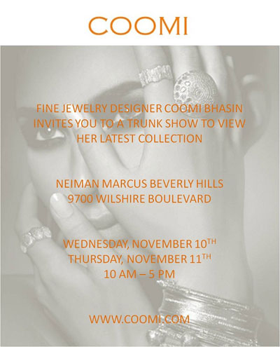 WHY: Fine jewelry designer Coomi Bhasin invites you to a trunk show to view her latest collection.