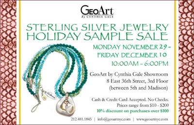 WHY: GeoArt by Cynthia Gale Sterling Silver Jewelry Holiday Sample Sale. Prices range from $10 – $200. Additional 10% discount on cash purchases over $100.