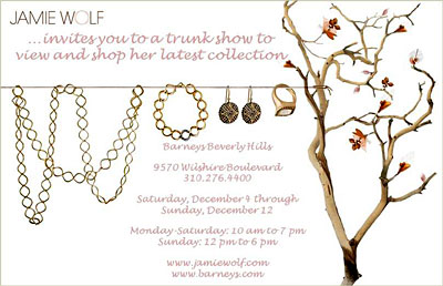 WHY: Jamie Wolf invites you to her trunk show at Barneys in Beverly Hills. Pieces from fine jewelry designer Jamie Wolf’s latest collection will be on display to view and purchase.
