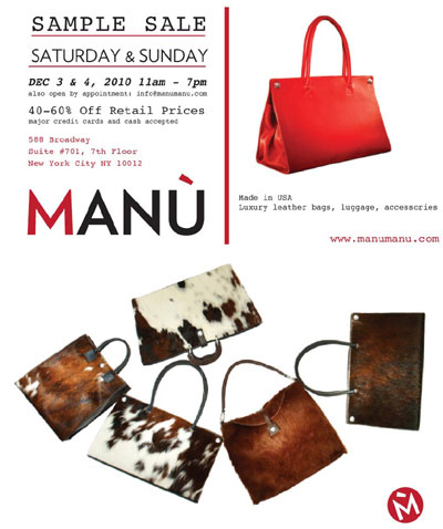WHY: 40-60% off handbags, luggage, and accessories (writing folios, wallets, and more) at the Manu Sample Sale.