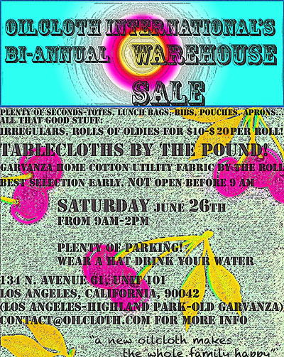WHY: The Bi Annual Warehouse Sale at Oil Cloth International is on Saturday. Save 50% on oilcloth totes, lunch bags, tablecloths, fabric and more.